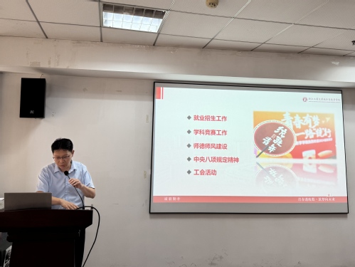 沈绍伟副书记全面梳理了学院近期工作进展:面对招生就业压力,鼓励教师积极参与招生宣传工作,共同提升影响力;学科竞赛取得良好成绩,但部分项目仍需努力达成预期目标。同时重点强调三项纪律要求:严守师德师风底线、规范学科经费使用、落实中央八项规定精神(严查违规吃喝等问题),要求全体教师令行禁止。