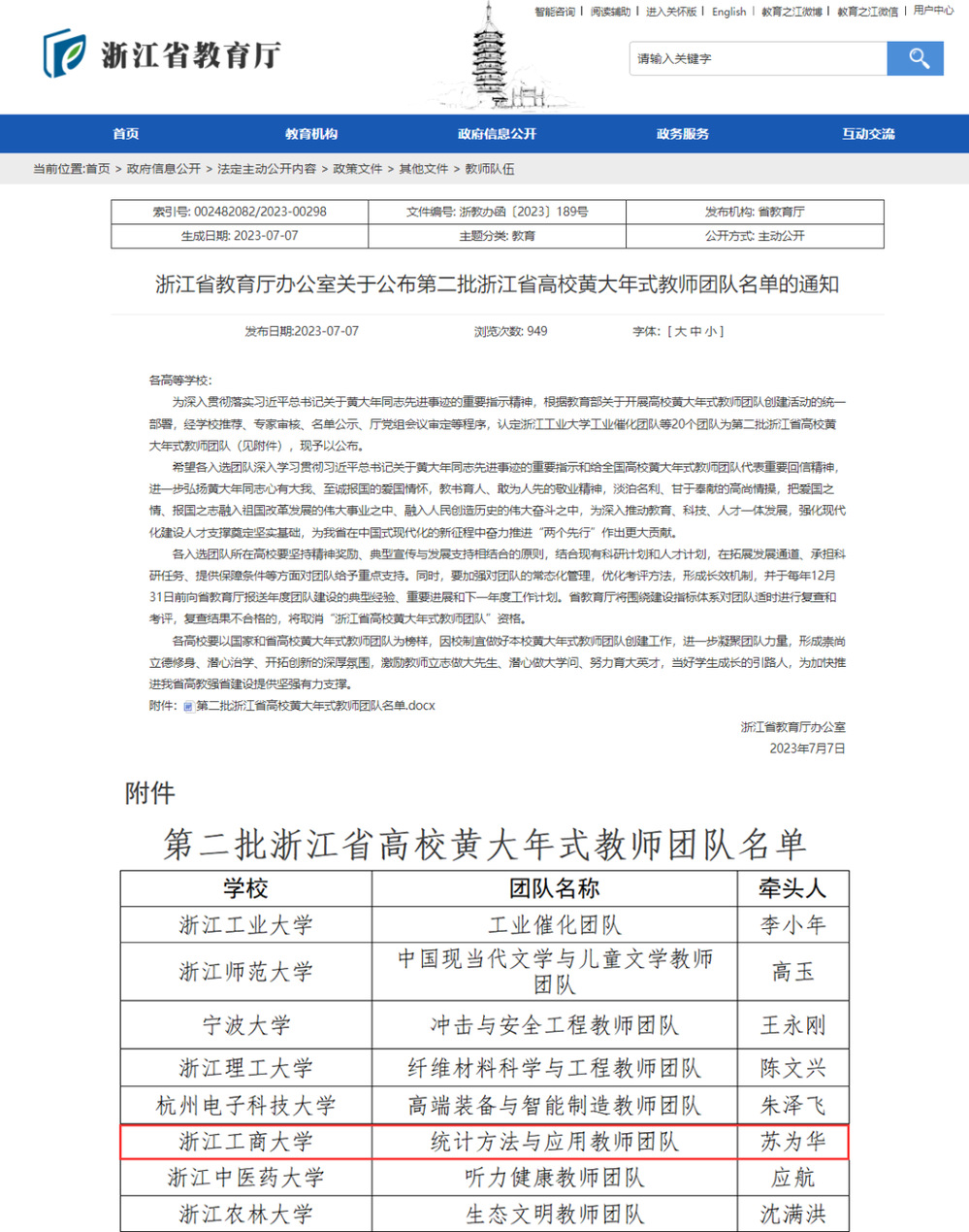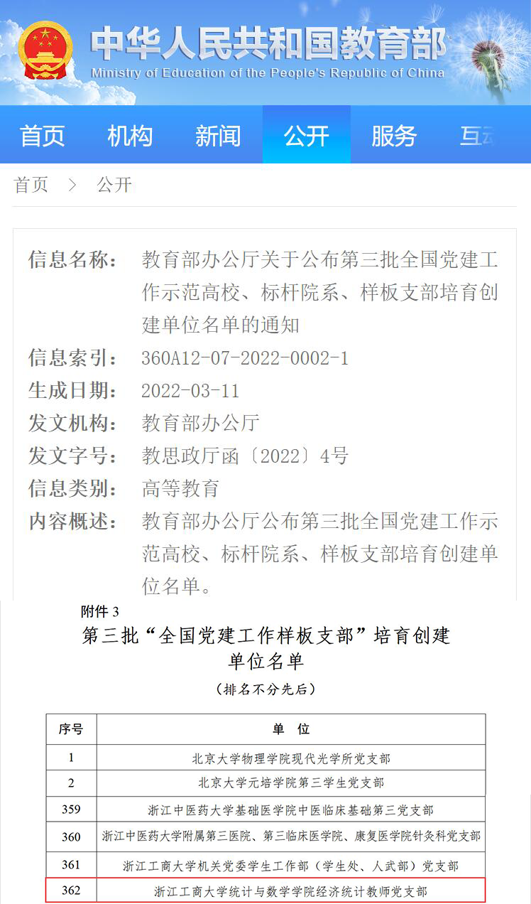 党建全面引领教学,铸造教师队伍新标杆。将党建工作与学院教学工作、育人工作全面结合,加强教师党支部建设,积极发挥党员教师的先锋模范作用发扬“教学、科研、师德”传帮带优良传统,带动教学队伍迭代升级。涌现出一批的政治素质过硬、业务能力精湛、育人水平高超示范典型,获评新时代浙江省千名好支书、新时代浙江省万名好党员、浙江省高校优秀共产党员、浙江省师德楷模、浙江省三育人先进个人、浙江省优秀教师等省级以上荣誉38人次。学院党委入选第四批“全国党建工作标杆院系”,经济统计教师党支部入选第三批“全国党建工作样板支部”(2022),张崇辉团队入选全国高校 “双带头人”教师党支部书记“强国行”专项行动团队(2024),经济统计教师党支部书记工作室入选第二批全省高校“双带头人”教师党支部书记工作室建设单位(2023),学院党委获浙江省高校先进基层党组织(2021),学院获省“三育人”岗位建功先进集体(2020),统计方法与应用教师团队入选浙江省第二批高校黄大年式教师团队(2023)。