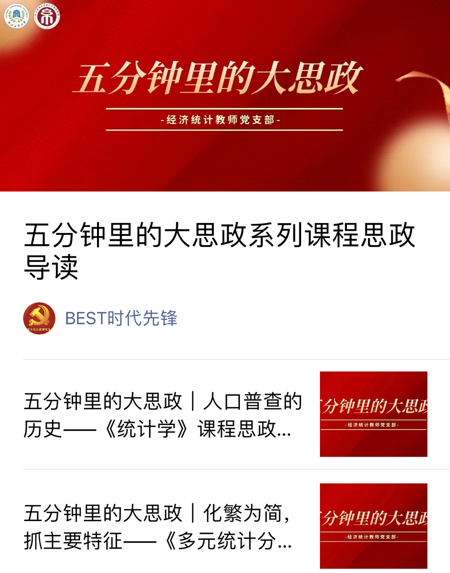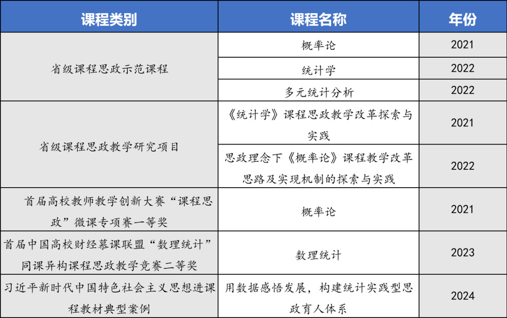 思政深度融入课堂,构建课程思政新体系。学院教师团队始终坚守“为党育人、为国育才”的初心使命,紧紧围绕立德树人根本任务,构建思政教育与专业教育交互、产教互融、科教互促的“三交互”育人体系,培育德智体美劳全面发展的新时代卓越统计人才。强化课程思政和思政课程建设,实施专业核心课程思政导读行动,《统计学》《概率论》《多元统计分析》等三门课程获批浙江省课程思政示范课程,教师团队多位教师参与省级课程思政微课比赛获奖,经济统计系获批浙江省课程思政示范基层教学组织(2023)。