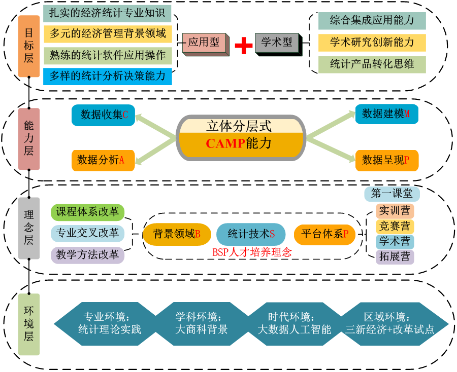 (1)面向新时代,创新人才培养模式。学院自2008年起开展应用型高级统计人才培养模式的探索,获批国家级教育改革示范点。近年来,围绕数字时代的统计专业人才培养的新要求,结合统计与数据科学的专业特点,开展了以CAMP能力为核心、BSP为培养理念,构建了第一课堂、竞赛营、学术营、实践营、拓展营的“1+4”培养路径。积极探索创新拔尖人才培养模式,开设经济统计学专业拔尖创新人才实验班,采用“小班化、贯通制、导师制”的培养方式,通过教学资源提质升级、立体式科研能力训练、进阶式激励评价等制度设计,探索本硕博一体化培养。