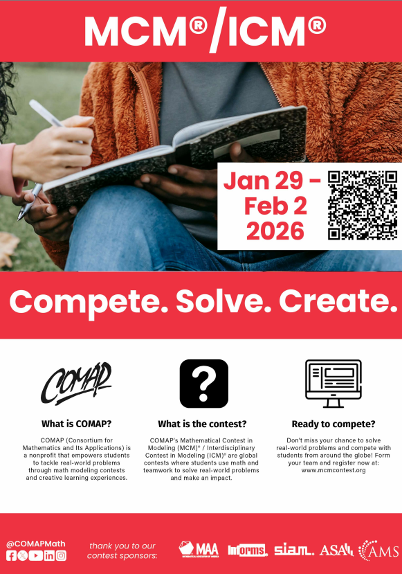 2026年美国大学生数学建模竞赛(MCM)及交叉学科建模竞赛(ICM)将于美国东部时间2026年1月29日17时-2月2日20时举行,北京时间是1月30日早上6时-2月3日上午9时。欢迎对数学建模感兴趣的,有志于数学建模竞赛的同学报名。